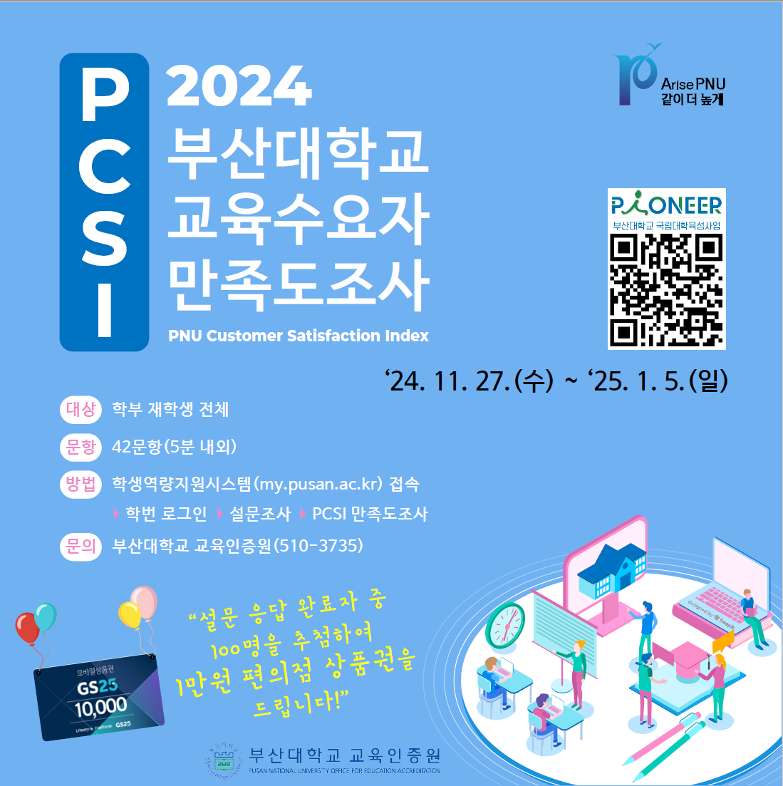 ?2024 부산대학교 교육수요자 만족도조사(PCSI: PNU Customer Satisfaction Index)?를 아래와 같이 실시합니다.